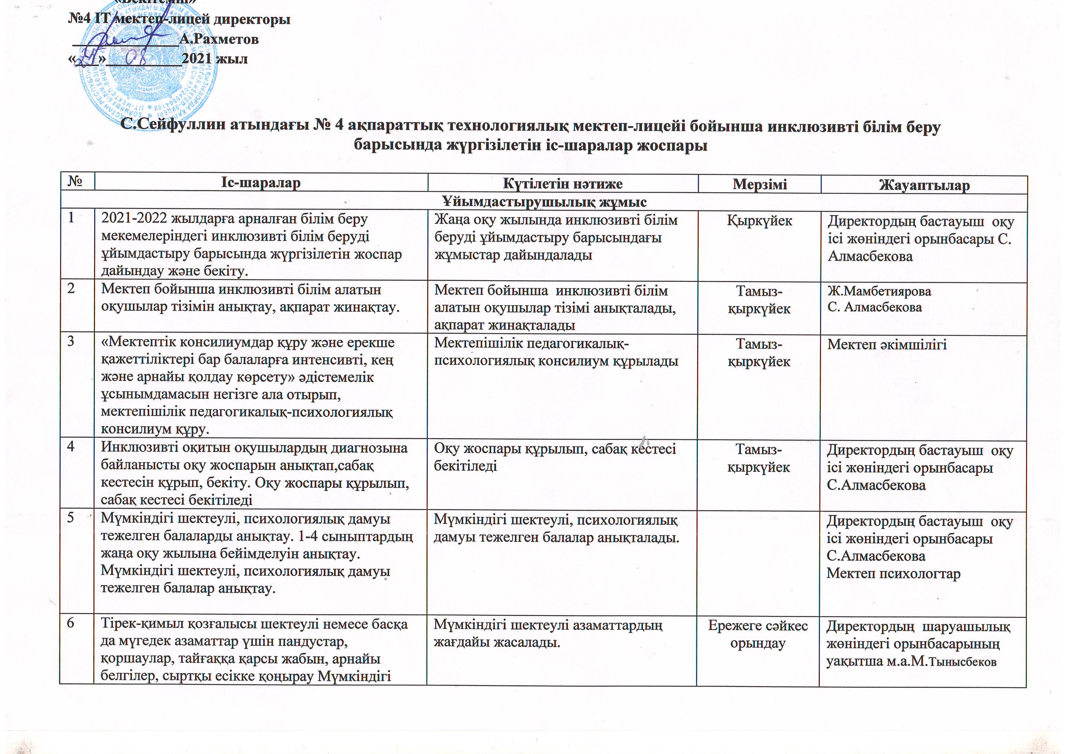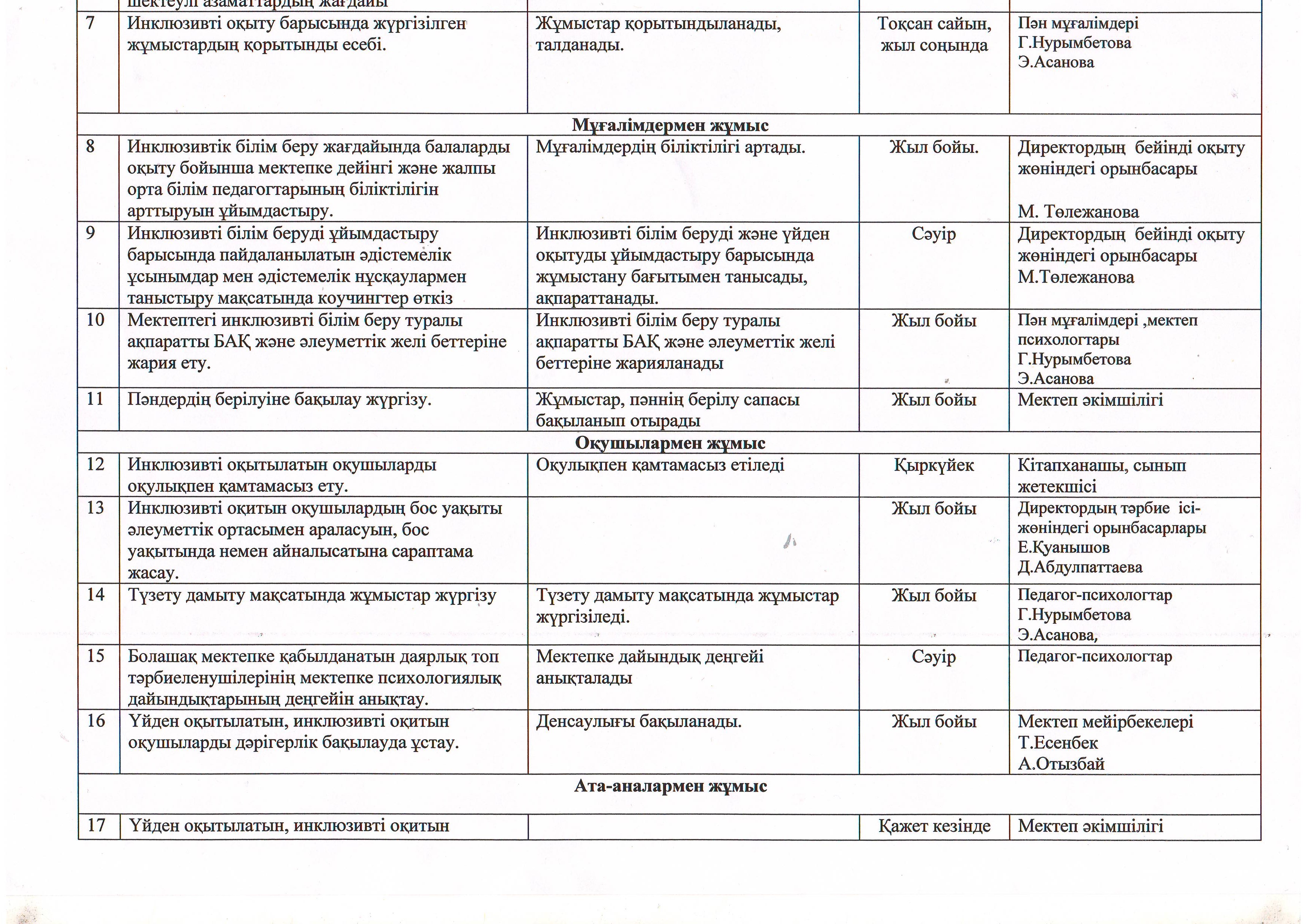 Инклюзивті білім беру барысында жүргізілетін іс-шаралар жоспары
